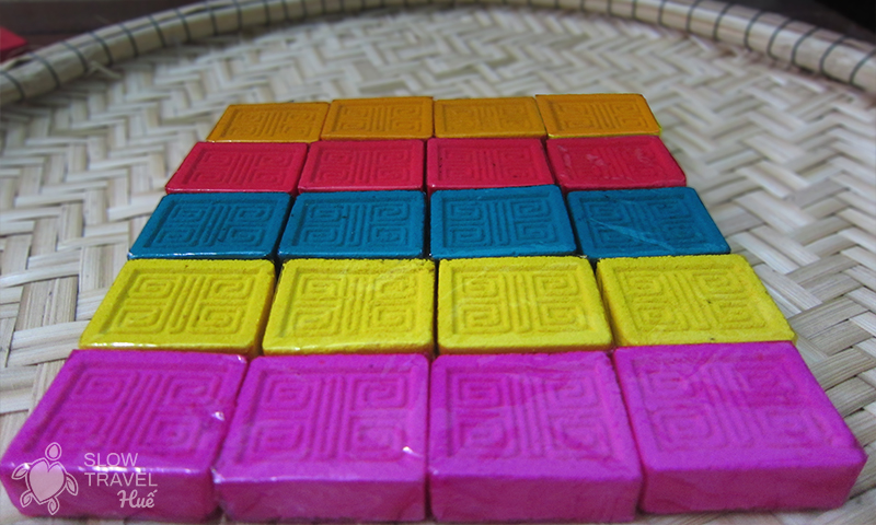 People wrap these cakes with five-color papers. The five colors represent five orient philosophies: Wood, Metal, Earth, Water, Fire. That why mung bean cake or Bánh In has another name five-color cake. The desert to offer for the King is usually in square form, colorful, and with longevity symbol upon the surface. It represented the long-live wish from the commoners to their leader and become famous Hue local food.