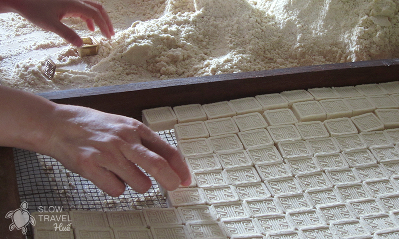 Third, dry this cake for ten hours by wood coal in order to store the cake as long as possible without being musty. The fourth step is to mix the flour with sugar at an approximate rate. The handicraft man needs to make sure of the harmony between flour and sugar. The best flavor of this Hue local food is lightly sweet.