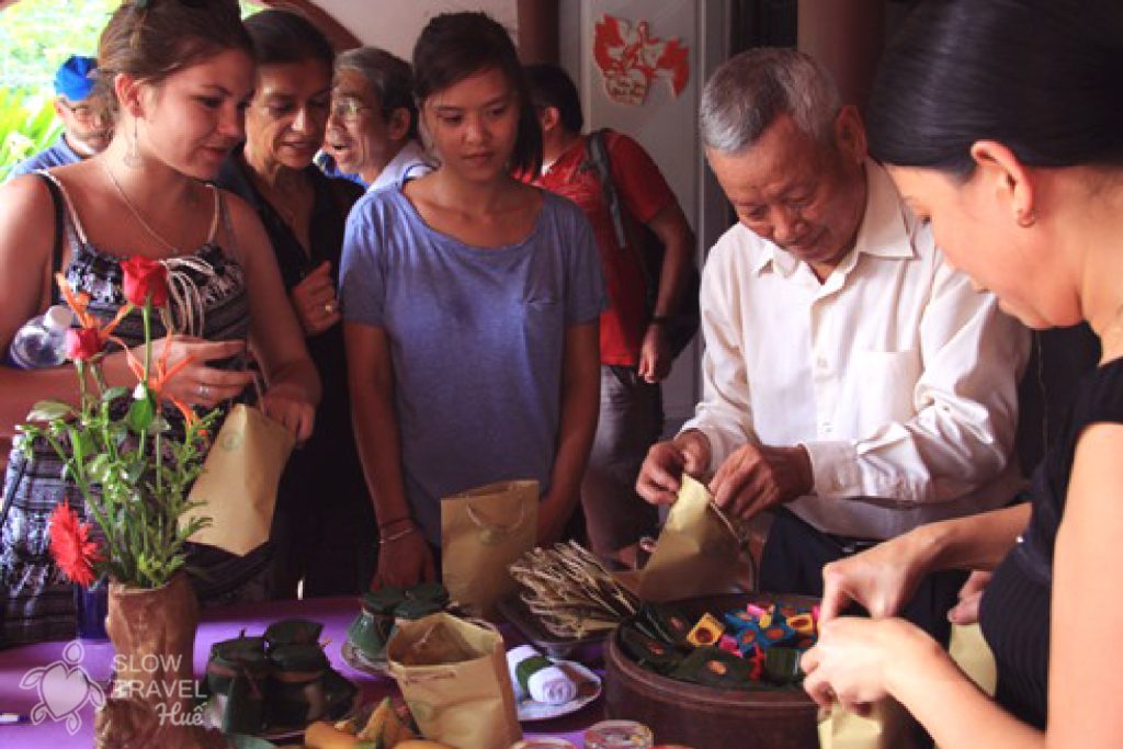 During the Slow Travel cycling tour in Hue, you will have the chance to visit a Lord land – Kim Long village. This place located a lot of ancient houses and traditional handicrafts. After a nice cycling tour in Hue, you will enter Mr. Nghệ’s house – an ancient mandarin house with a large garden. He will welcome you by traditional green tea, let you take a look at the old house and discover the jungle Hue garden, taste some local fruits. Mrs Sâm will invite you to come to her kitchen and help a hand to prepare some traditional food. Join in and enjoy a simple but traditional generous home meal in a Hue family is an awesome experience. At last, indulge yourselves at herbal a footbath from garden leaves – local treatment of Kim Long residents.