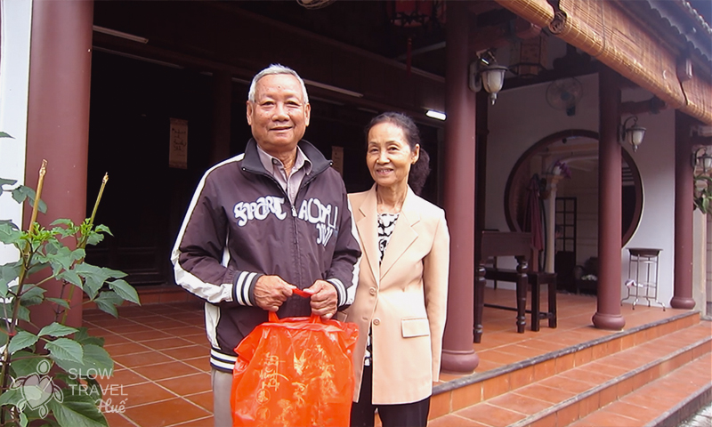 Mr. Nghệ is the descendant of Nguyen Lord, his full name is Tôn Thất Nghệ. In Hue, when you heard the surname Tôn Thất for men and Tôn Nữ for women, that means they are from the royal family. Mr Nghệ is the first host of our cycling tour in Hue service team. He has kept the family’s tradition very well and developed it for the grandchildren. His ancient house is approximately 200 years old. It has the Chinese word Chấn Gia Phong upon which literally means Protect and Develop Family Tradition. In fact, his family is absolutely perfect. There are three generations living in an ancient house with five children and eleven grandchildren. He builds another modern house next to for the growth of family members. All of them live around the village and always help their parents when our tourists come. They all are very happy and kind to tourists and tour guides. Mrs. Sam (his wife) happily shows us off the pictures that their children and grandchildren hold a surprisingly 50th wedding Anniversary for the old couple.